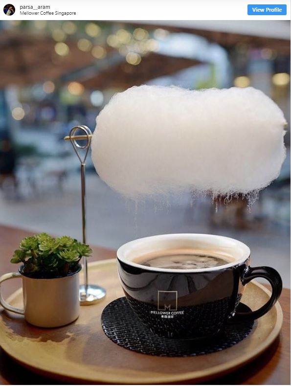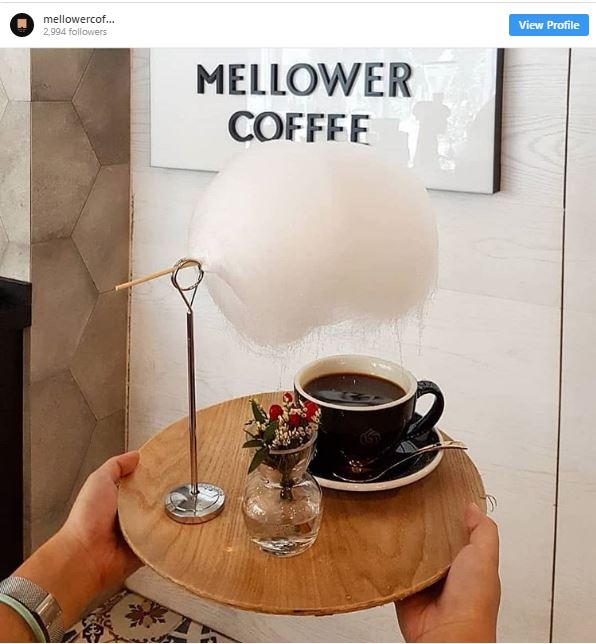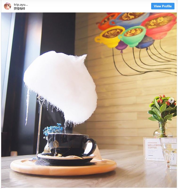 솜사탕을 구름처럼 걸어두면, 따뜻한 커피 증기로 인해 솜사탕이 녹으면서 설탕비가 내린다.