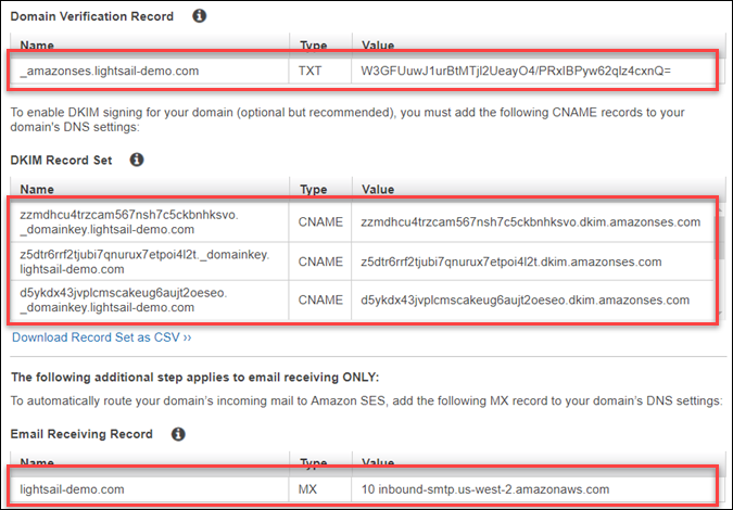 - Amazon SES 콘솔에서 DNS 레코드를 추가합니다. Lightsail에서 DNS 영역을 편집하는 방법에 대한 자세한 내용은 Amazon Lightsail에서 DNS 영역 편집을 참조하십시오.