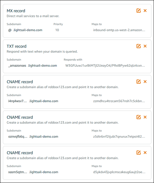 Amazon SES 콘솔에서 DNS 레코드를 추가합니다. Lightsail에서 DNS 영역을 편집하는 방법에 대한 자세한 내용은 Amazon Lightsail에서 DNS 영역 편집을 참조하십시오. 결과는 다음 예제와 같아야 합니다. 참고