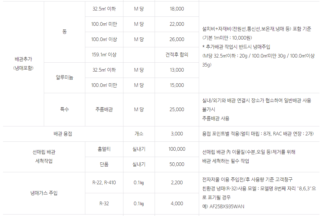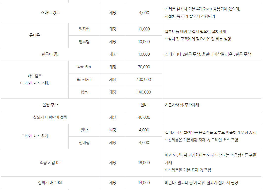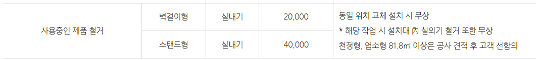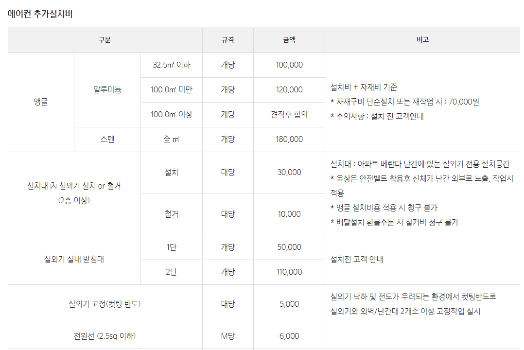 삼성의 에어컨 이전 설치, 재설치, 철거 비용은 아래와 같습니다.
