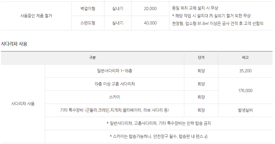 에어컨 철거의 경우 어떤 업체에서 해도 엄청난 차이가 있지는 않습니다. 그래서 이사업체를 통해 철거를 하셔도 무방합니다. (에어컨 철거편 참고)